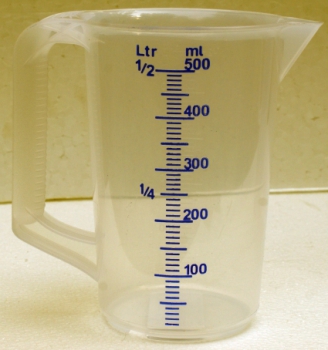 Plastic measuring jug, transparent; with embossed scales (colourless and blue - except 250 ml beaker, which is only colourless)